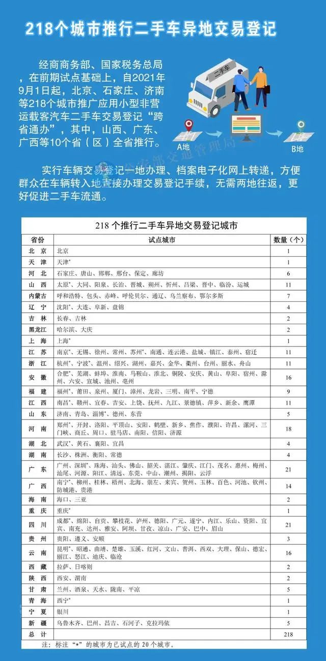 自9月1日起 全国218个城市二手车可以异地交易登记